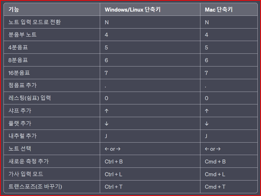 | | 기능 | Windows/Linux 단축키 | Mac 단축키 | |-------------------------|---------------------|-----------| | 노트 입력 모드로 전환 | N | N | | 분음부 노트 | 4 | 4 | | 4분음표 | 5 | 5 | | 8분음표 | 6 | 6 | | 16분음표 | 7 | 7 | | 점음표 추가 | . | . | | 레스팅(쉼표) 입력 | 0 | 0 | | 샤프 추가 | ↑ | ↑ | | 플랫 추가 | ↓ | ↓ | | 내추럴 추가 | J | J | | 노트 선택 | ← or → | ← or → | | 새로운 측정 추가 | Ctrl + B | Cmd + B | | 가사 입력 모드 | Ctrl + L | Cmd + L | | 트랜스포즈(조 바꾸기) | Ctrl + T | Cmd + T | |