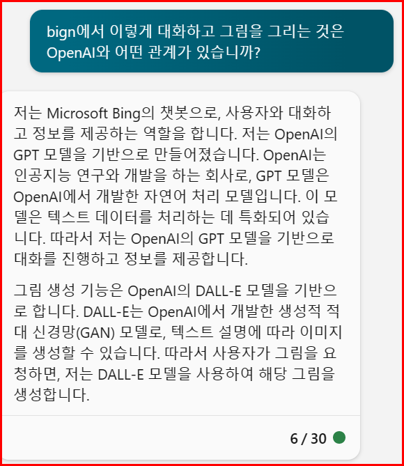 직접 물었습니다. BingChat에게. OpenAI의 GPT 모델을 기반으로 만들어졌다고 고백합니다. ChatGPT를 기반으로 대화를 진행한다는 얘기입니다. 대화 형식으로 얘기를 끌어가다가 그림을 그리라고 하면 DALL-E의 기능을 이용하여 그림도 그릴 수 있다고 합니다.