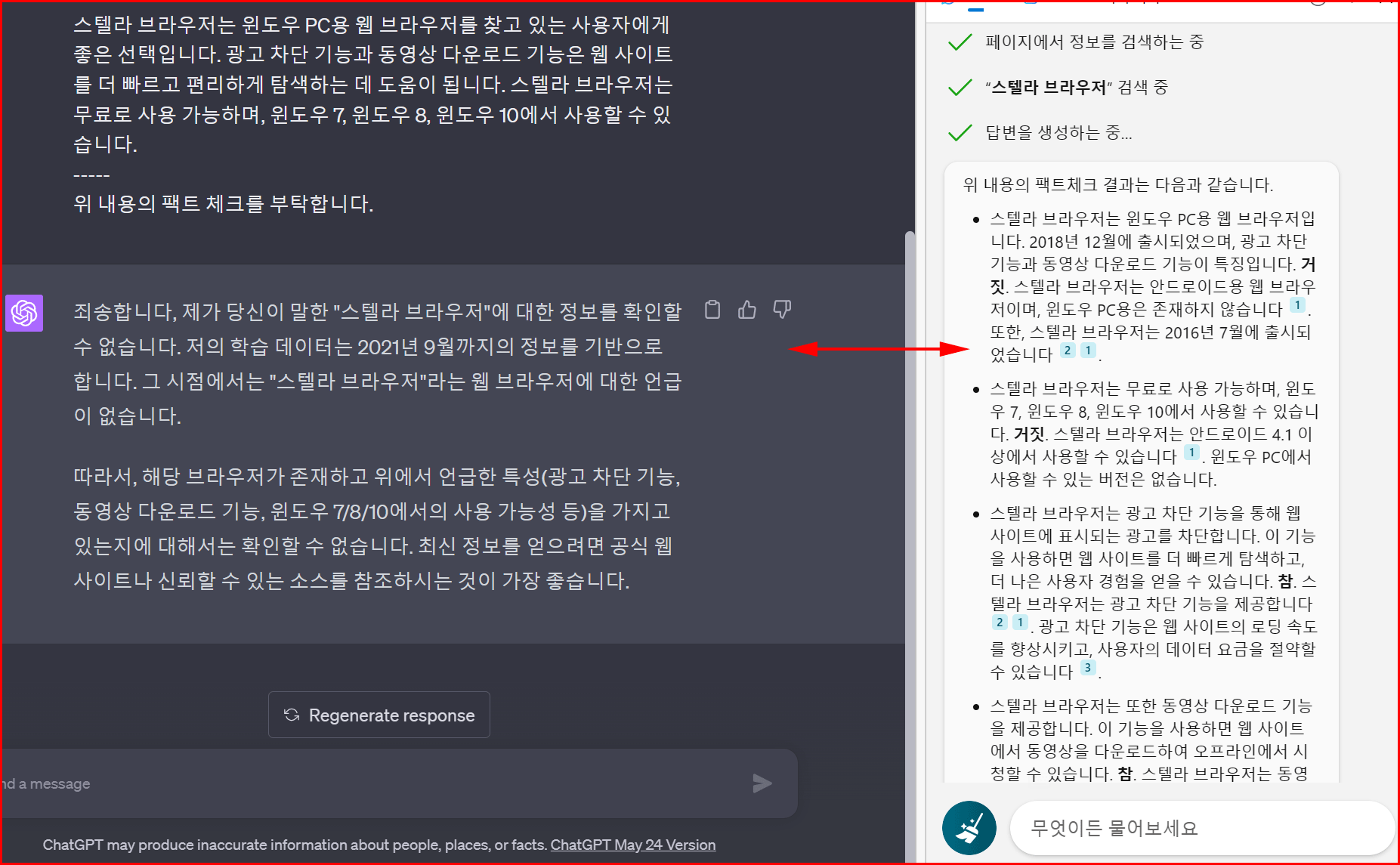 ChatGPT는 OpenAI사의 글을 생성하는 인공지능입니다. BingChat은 이 인공지능을 이용하여 마이크로소프트사에서 운영하는 인공지능 챗봇입니다. 이 둘은 비슷한 듯하면서도 다릅니다. 같은 내용의 질문을 했을 때, 처리하는 방식이 다릅니다. ChatGPT는 바로 답을 만들어줍니다. BingChat은 검색을 확장하여 답안을 선택하도록 합니다.