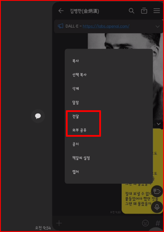 '외부공유'의 본래 의미는 다른 앱(카카오톡이 아닌)으로 내용을 공유하는 것을 의미합니다. 그러나 '카카오톡'을 선택한다고 해서 안될 것은 없다는 얘기입니다.