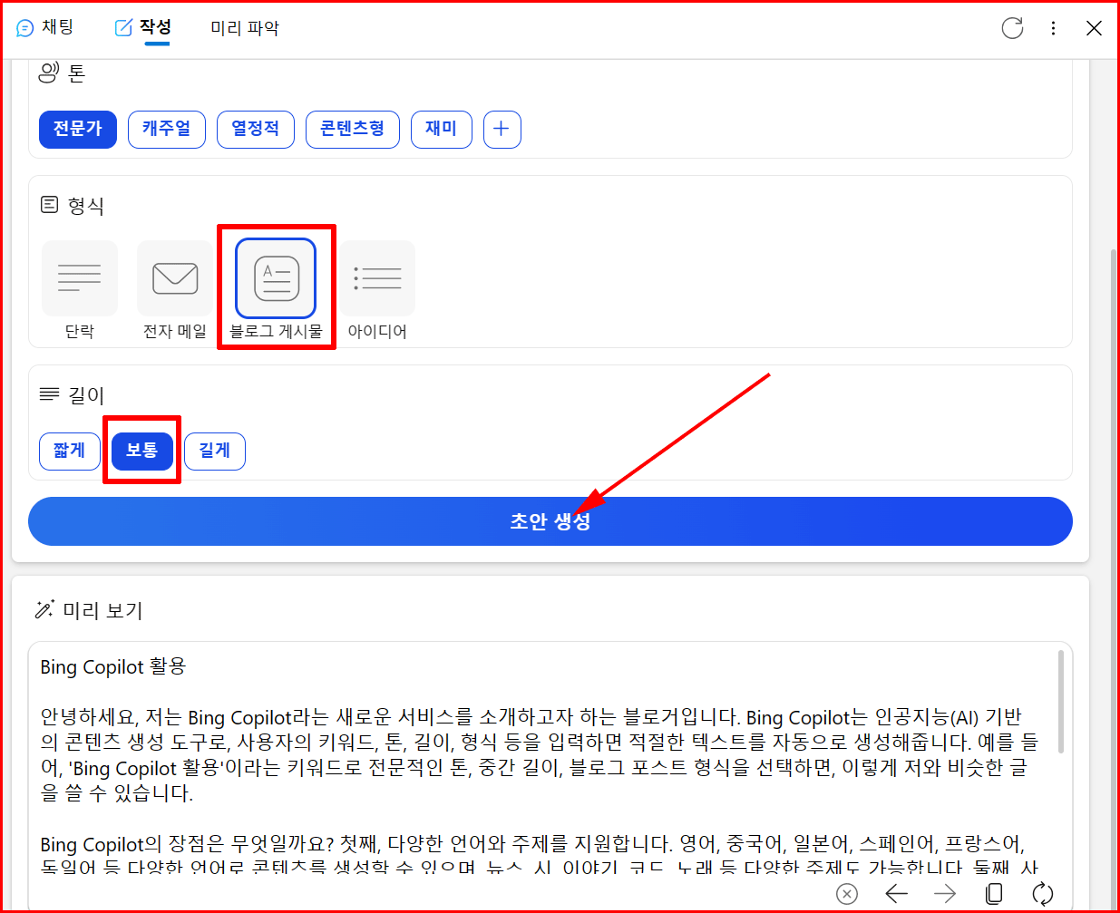안녕하세요, 저는 Bing Copilot라는 새로운 서비스를 소개하고자 하는 블로거입니다. Bing Copilot는 인공지능(AI) 기반의 콘텐츠 생성 도구로, 사용자의 키워드, 톤, 길이, 형식 등을 입력하면 적절한 텍스트를 자동으로 생성해줍니다. 예를 들어, 'Bing Copilot 활용'이라는 키워드로 전문적인 톤, 중간 길이, 블로그 포스트 형식을 선택하면, 이렇게 저와 비슷한 글을 쓸 수 있습니다.