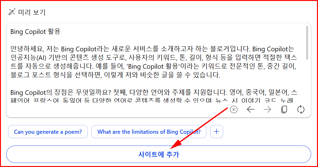 마이크로소프트 엣지 브라우저를 통해 서비스되는 Bing Copilot을 활용하여 'Bing Copilot 활용'에 대한 글을 부탁했습니다. 아래와 같이 '전문가' 톤으로 '블로그 게시물' 형식에 따라 '보통' 길이로 작성할 것을 요구한 결과는 아래 접은글에 게재했습니다.