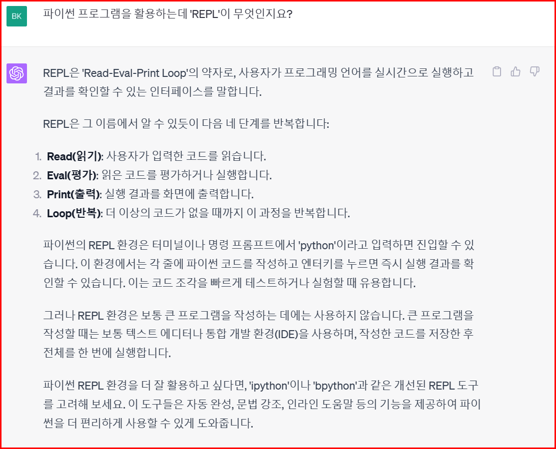 REPL의 개선된 모습을 볼 수 있습니다. 챗봇이 알려준 저런 기능들이 가능하리라는 판단이 듭니다.