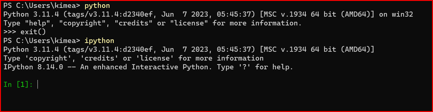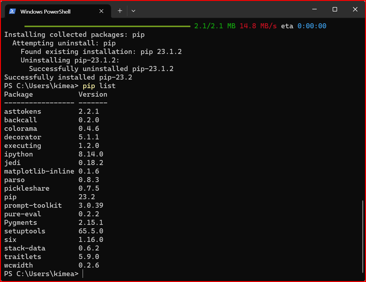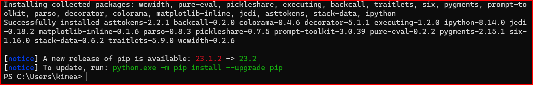 챗봇이 지도하는 대로 'ipython'을 설치했습니다. 설치 과정에서 'pip' 버전업이 됐다는 정보와 업그레이드 방법이 있어 그대로 진행했습니다.