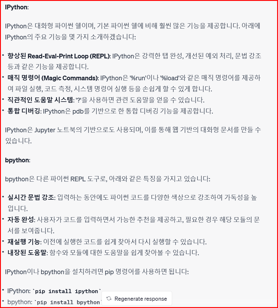 'ipython' 사용법을 질문했습니다. 챗봇 대답 중 일부입니다.