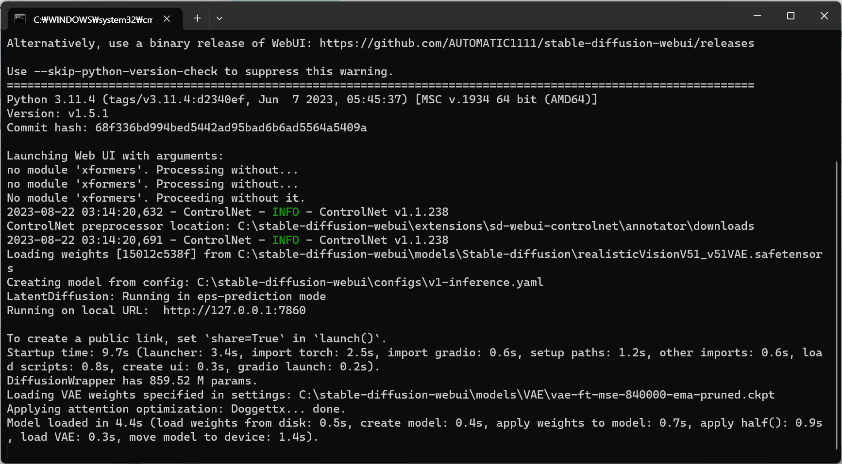 2. 모듈 및 의존성 검사: 'xformers'라는 모듈이 없어서 이 모듈 없이 처리가 진행됩니다. 이는 소프트웨어가 필요한 모든 라이브러리나 모듈이 설치되어 있는지 확인하는 단계로 보입니다.