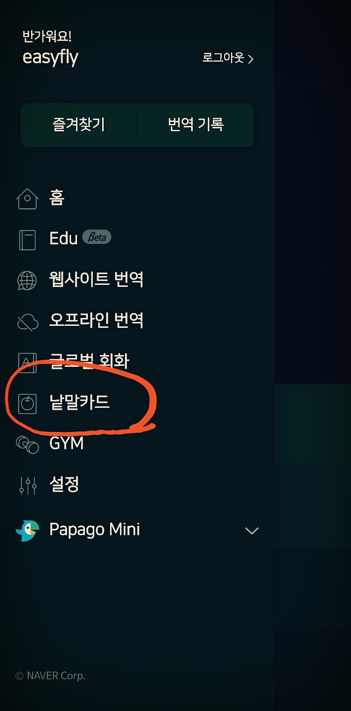 낱말카드를 다운 받으려면 파파고 초기 화면에서 '세줄메뉴'를 선택합니다. 그리고 '낱말카드'를 찾으면 됩니다.