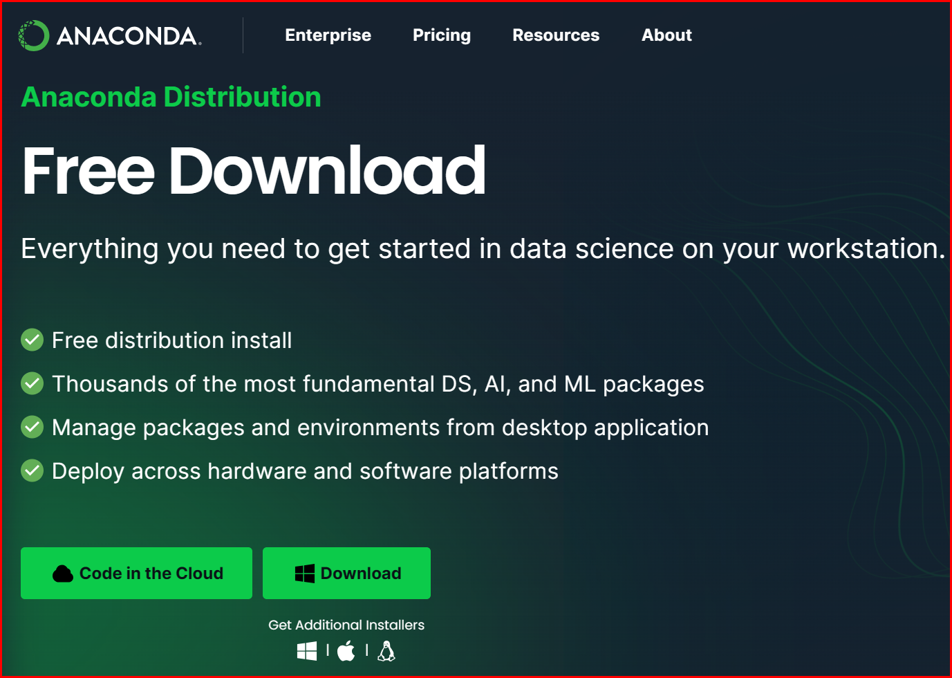 - 아나콘다의 공식 웹사이트 [ https://www.anaconda.com/download]에서 운영체제에 맞는 설치 파일을 다운로드합니다.