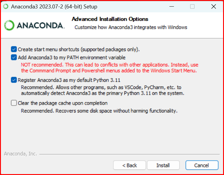 설치 폴더는 자신의 계정 폴더에 'anaconda3' 폴더가 만들어집니다. 'Add Anaconda3 to my PATH environment variable'을 선택하여 진행합니다. 경로명이 알려져야 프로그램을 원활하게 운영할 수 있습니다.