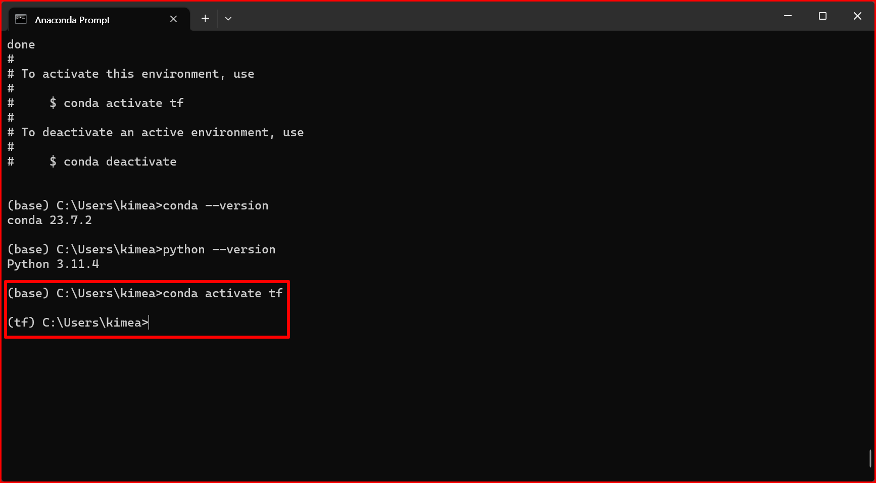 가상 환경을 활성화하려면 아나콘다 프롬프트에서 conda activate [env_name] 명령어를 입력합니다. 예를 들어, tf라는 가상 환경을 활성화하려면 'conda activate tf'를 입력합니다. 가상 환경을 비활성화하려면 'conda deactivate'를 입력합니다.