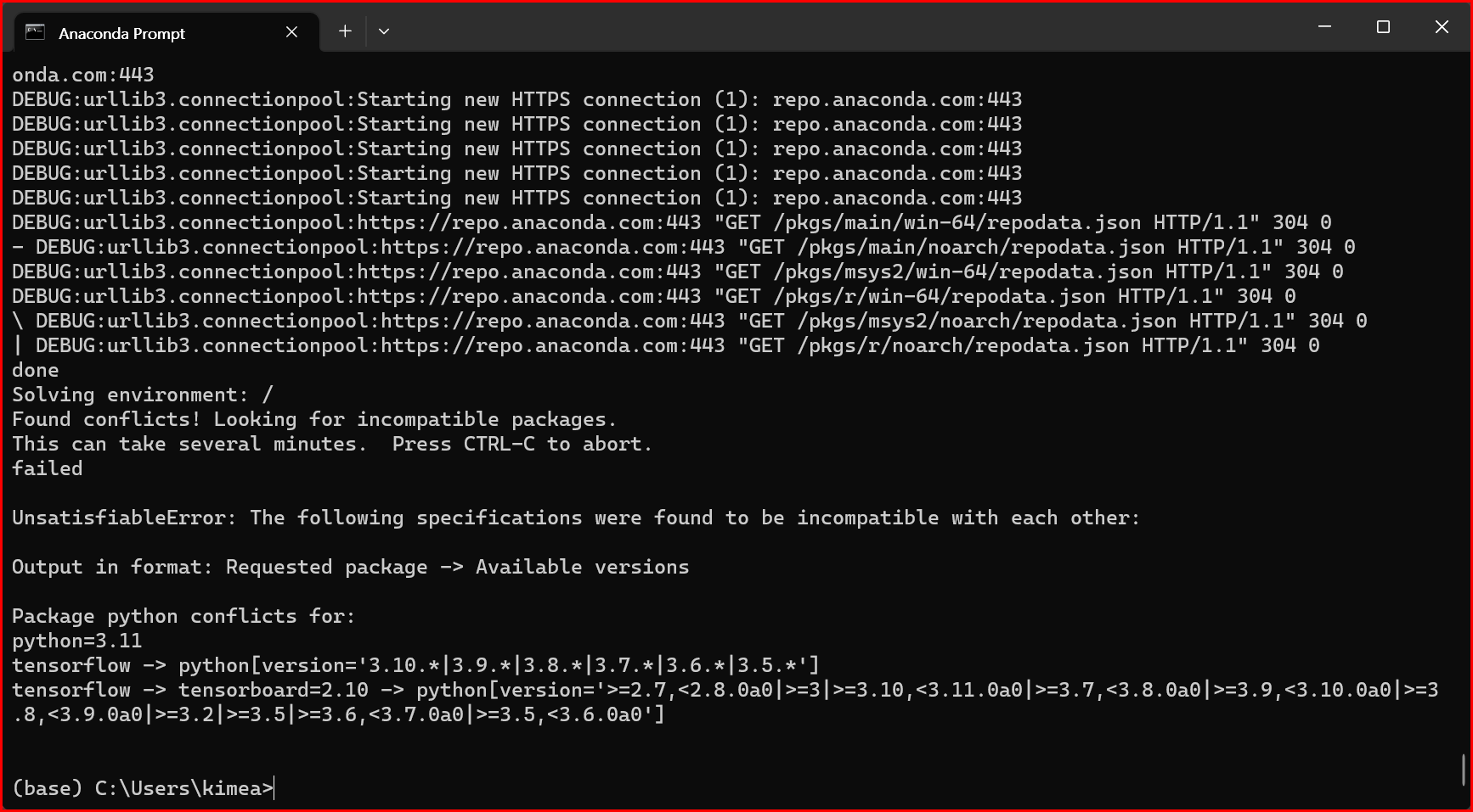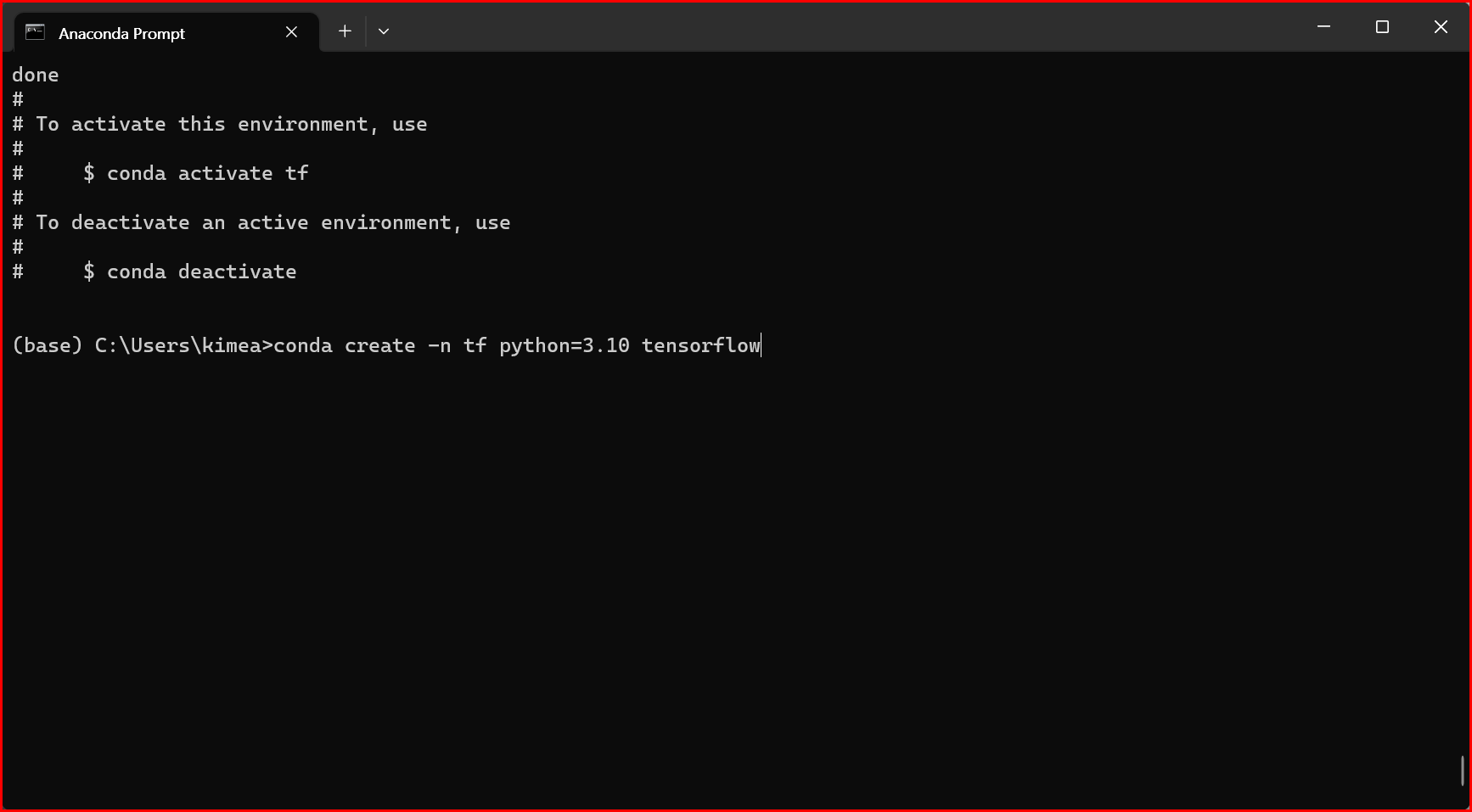 tensorflow 지원이 가능한 버전으로 다운그레이드해서 가상환경을 만듭니다.