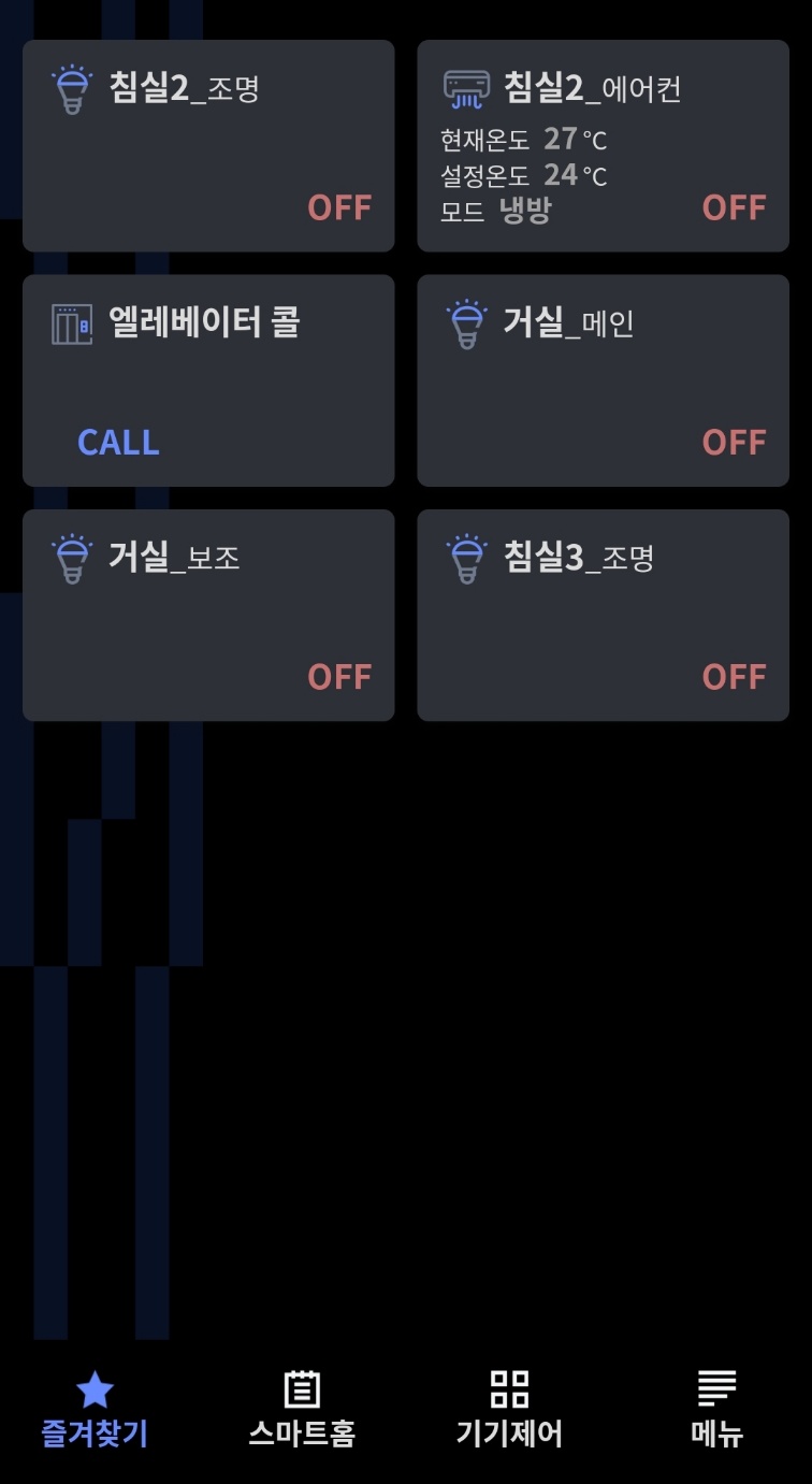 안드로이드에서 '더샵 AiQ'를 설치해서 사용하는 화면입니다. 각 방의 조명과 에어컨, 그리고 엘리베이터 콜 등을 원격으로 작동할 수 있습니다.