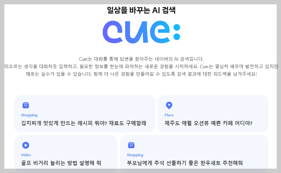 Cue는 단순히 텍스트로만 정보를 제공하는 것이 아니라, 이미지, 영상, 지도, 쇼핑 정보 등 다양한 형태의 콘텐츠로 제공합니다. 사용자의 필요에 따라 최적의 콘텐츠를 제공하기 위해 노력하고 있습니다.