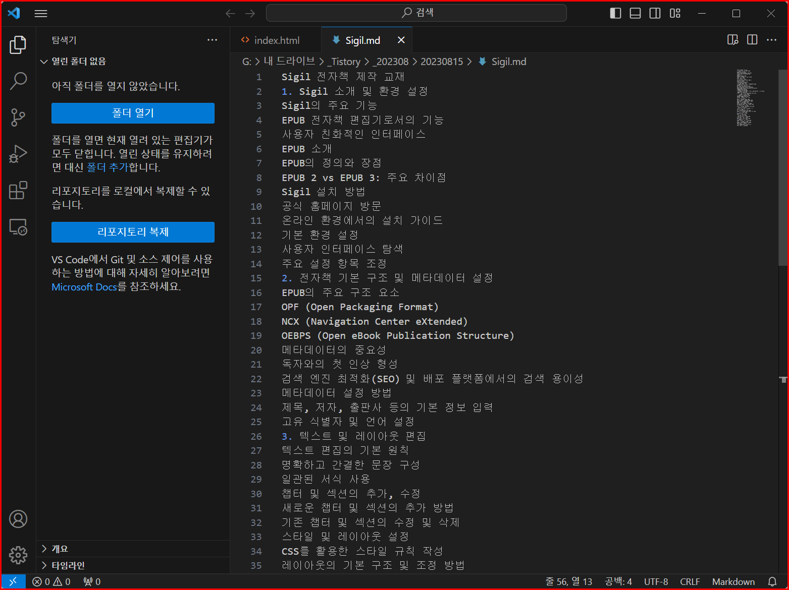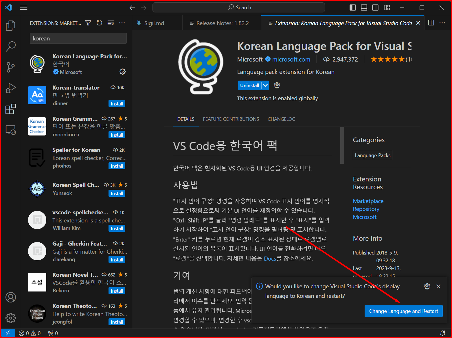 인스톨 후에에 VS Code를 재시작해야 한글이 적용됩니다. 우하단 [Change Language and Restart] 버튼으로 재시작합니다.