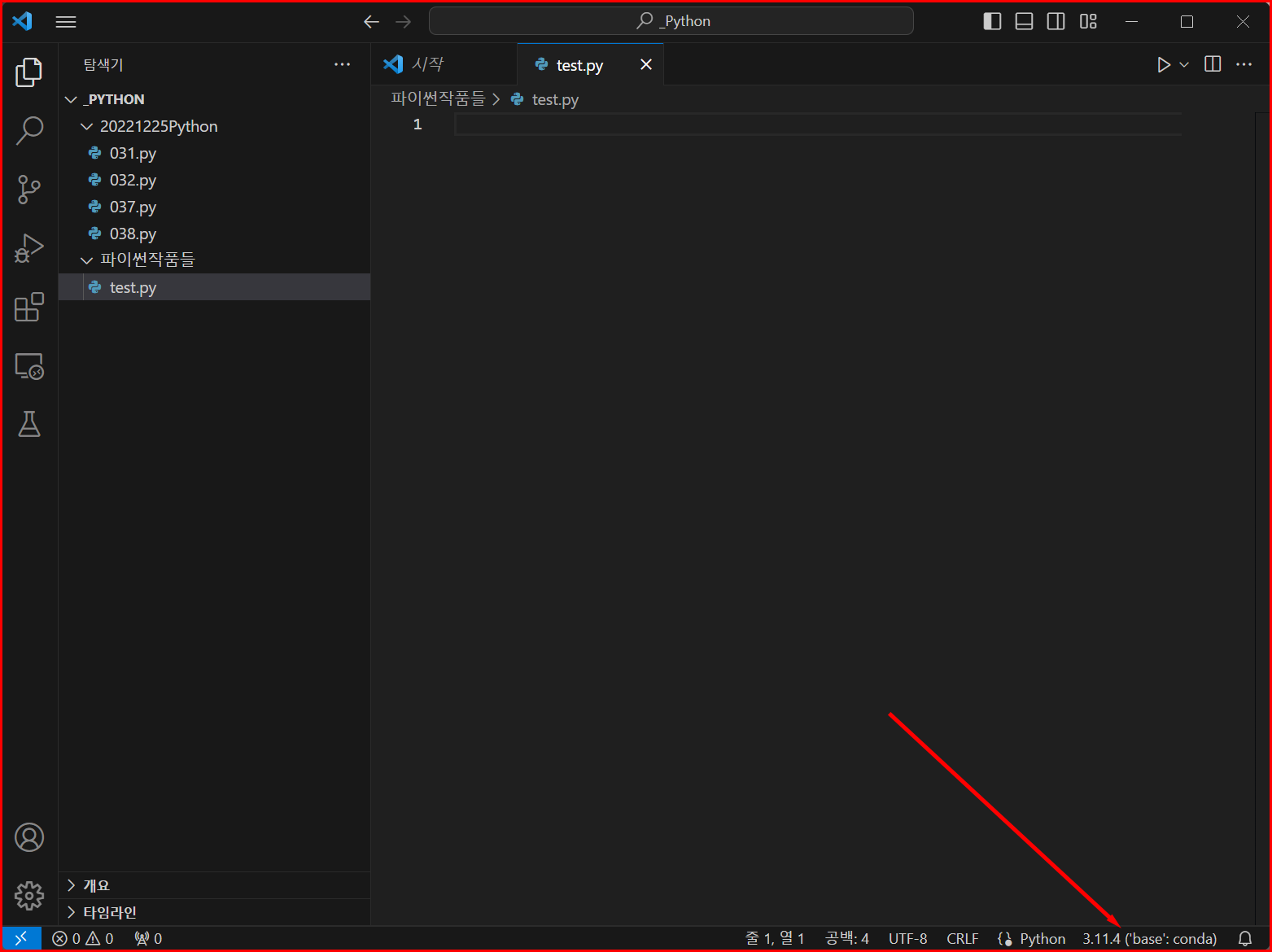 - VSCode 하단의 상태 표시줄에 현재 선택된 Python 인터프리터 버전이 표시됩니다. 만약 선택된 인터프리터가 없거나 다른 것을 사용하려면 이 부분을 클릭합니다.
