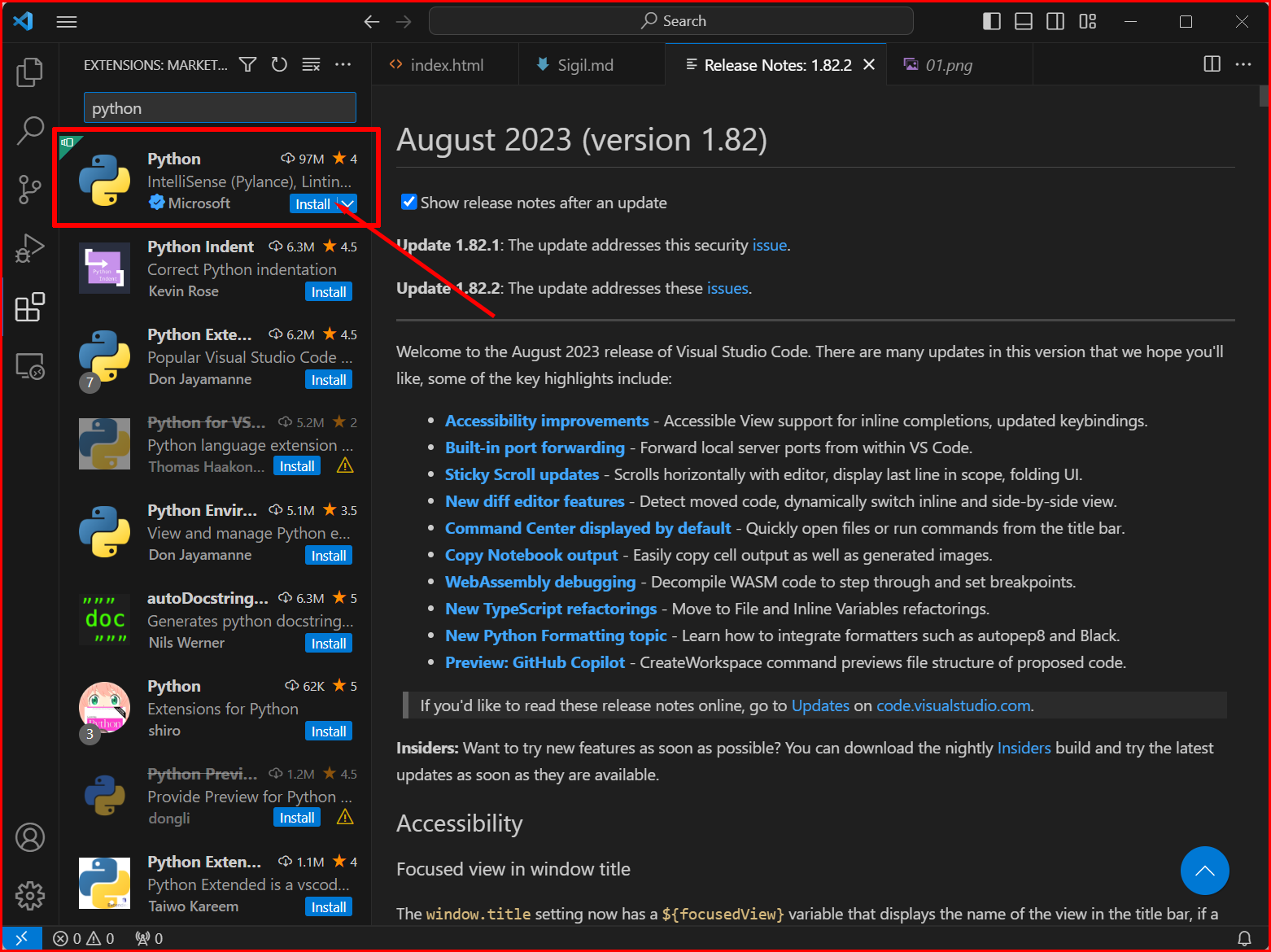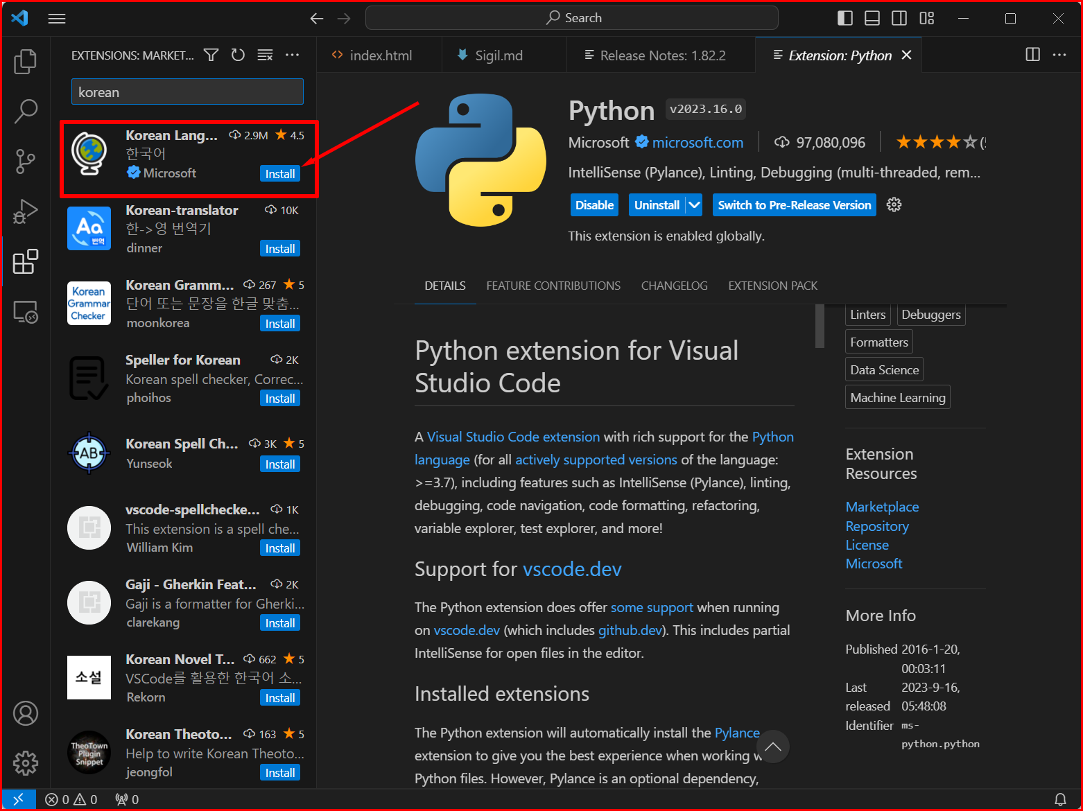 - 검색창에 "Python"이라고 입력하고, Microsoft에서 제공하는 Python 확장 프로그램을 설치합니다. 이 확장 프로그램은 VSCode에서 Python 코드를 작성하고 실행하는 데 필요한 모든 기능을 제공합니다.