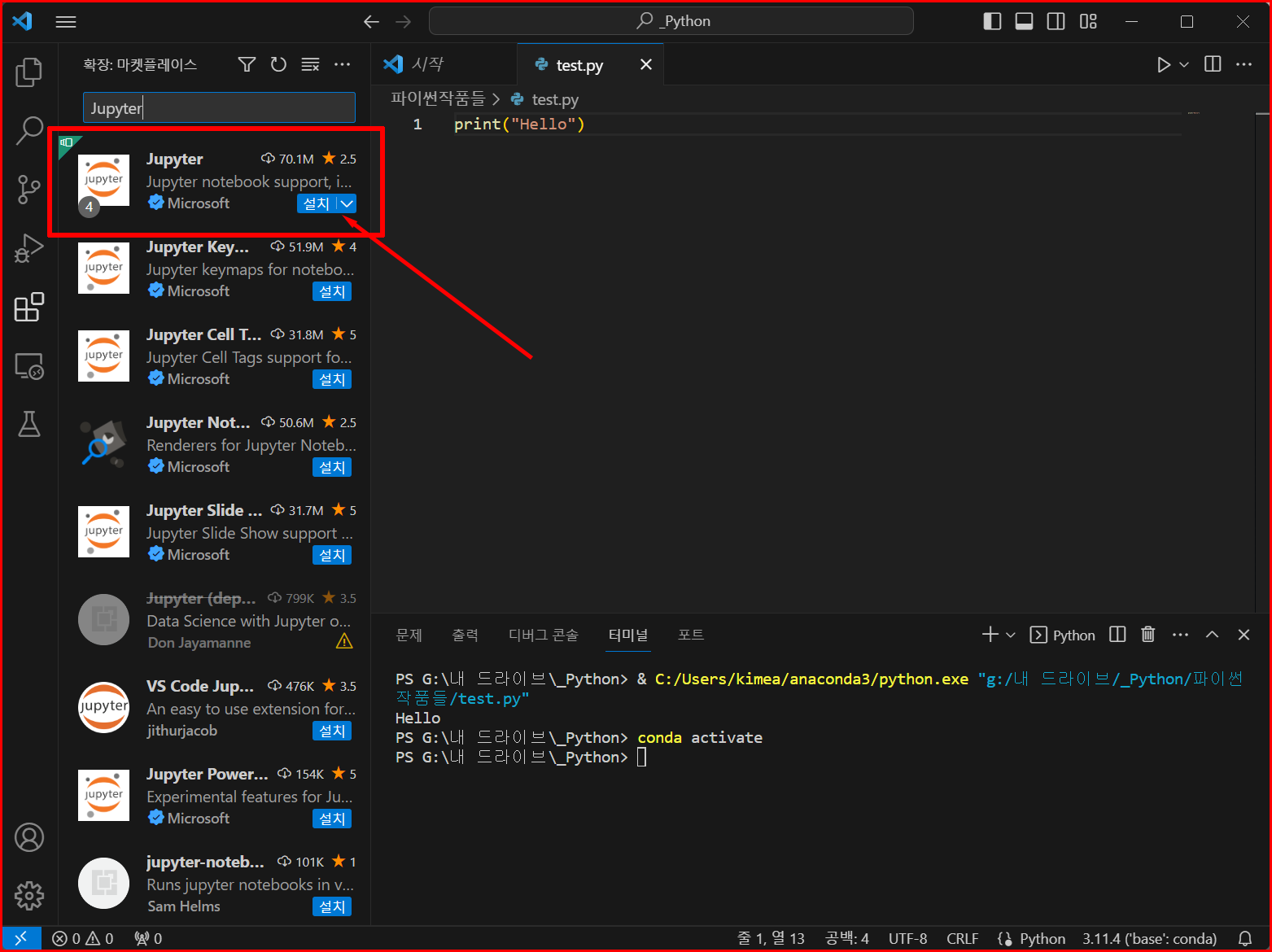 - Anaconda를 주로 Jupyter 노트북과 함께 사용한다면, "Jupyter" 확장 프로그램을 설치하여 VSCode에서 직접 노트북 파일을 편집하고 실행할 수 있습니다.