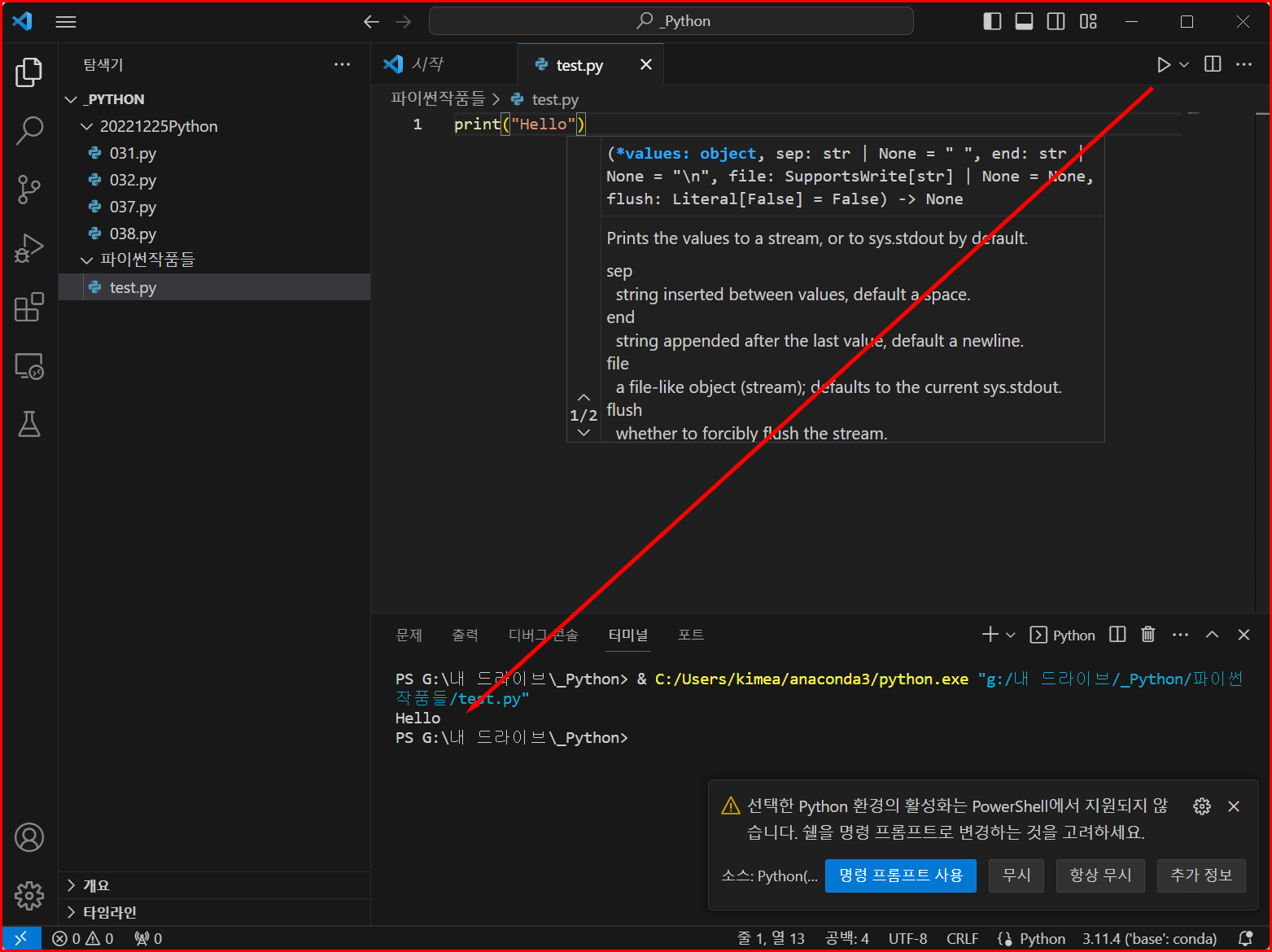 3. 통합 터미널에서 Anaconda 환경 활성화:
