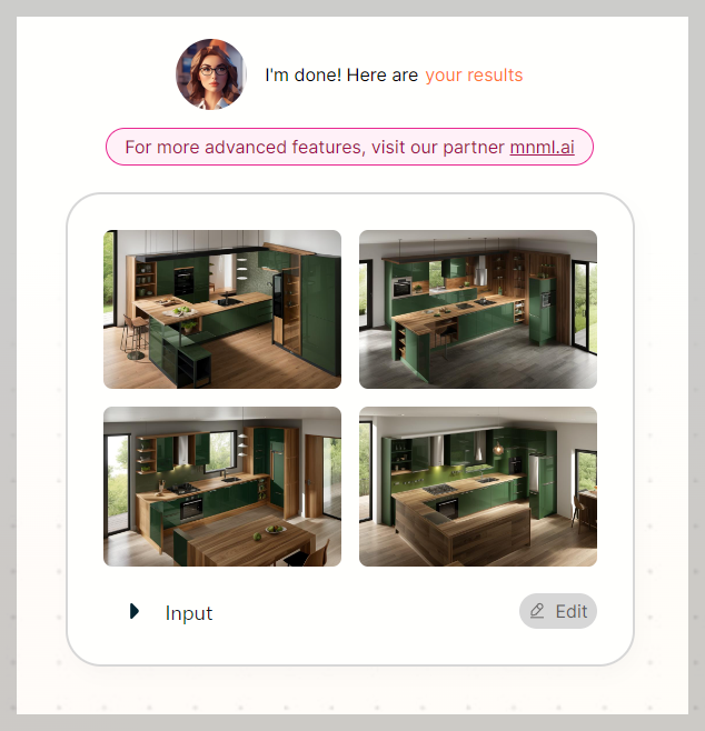 홈페이지에서 이미지를 올리거나 직접 스케치를 하면 그것을 기반으로 한 이미지를 산출합니다. 아래와 같은 작도된 이미지를 올려서 완성된 이미즐 만들어달라고 요구하면 아래와 같은 이미지 4장을 그려줍니다. 이 과정에서 AI가 작동됩니다.
