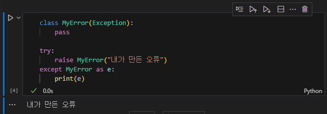 `Exception` 클래스를 상속받아 사용자 정의 예외를 만들 수 있습니다. 'pass'는 별도의 속성이나 메서드 없이 클래스를 정의하기 위해 사용됩니다. try-except 문을 이용하여 MyError가 출력되게 합니다.