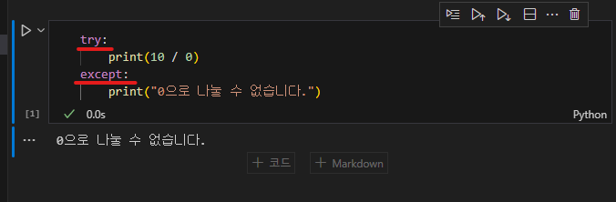 `try` 블록 안의 코드를 실행하다가 오류가 발생하면 `except` 블록이 실행됩니다.