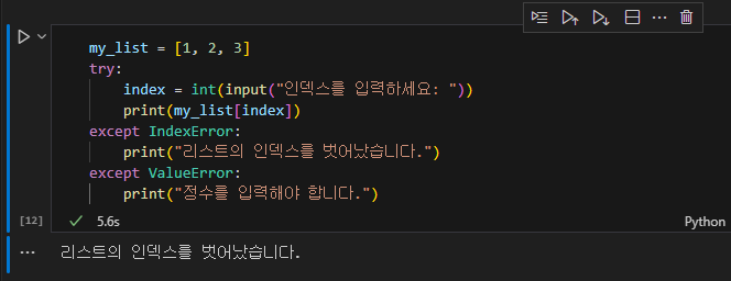 리스트와 관련된 여러 예외를 처리하는 예제입니다.