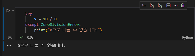 - `except` 절을 여러 개 사용할 때는 가장 구체적인 예외부터 처리해야 합니다.