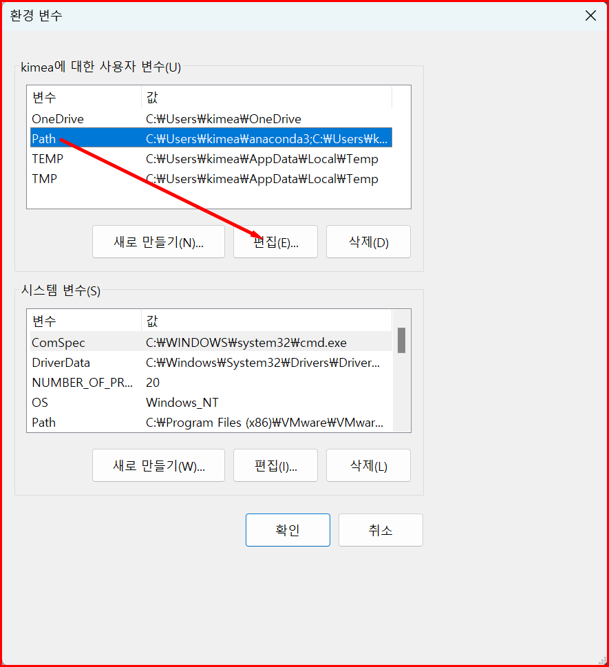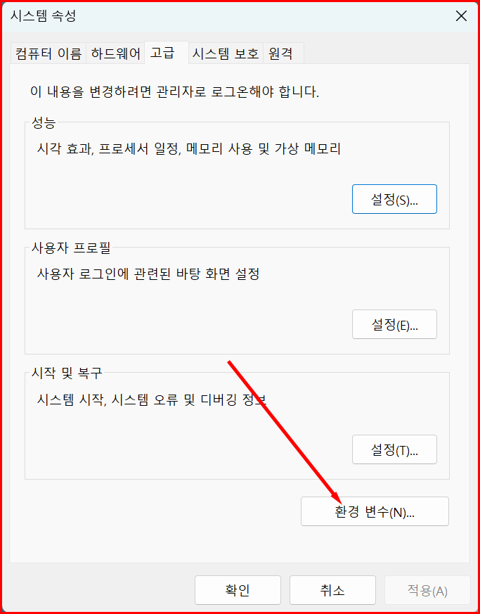 bin폴더 경로를 추가합니다.- 환경 변수 편집은 컴퓨터의 [시스템 속성] > [고급] > [환경 변수]에서 할 수 있습니다.