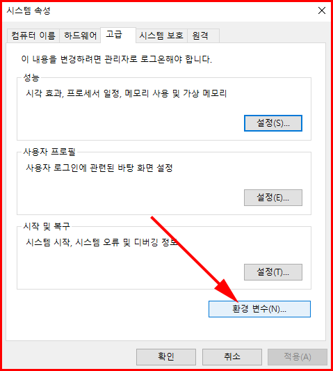 - 시스템 속성 창에서 '환경 변수(N)...' 버튼을 클릭합니다.