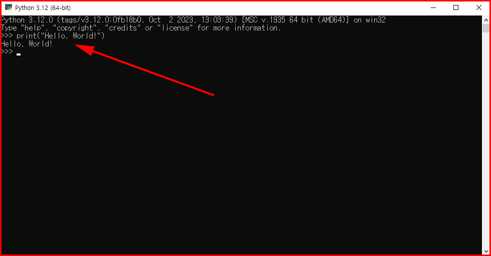print("Hello, World!")를 입력하면 화면에Hello, World!가 출력됩니다.