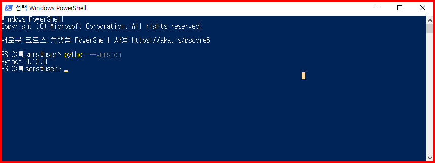 python --version혹은python -V명령어를 입력하여 설치된 파이썬의 버전을 확인합니다. - 정상적으로 설치되었다면, 파이썬 버전이 표시됩니다. 예를 들어,