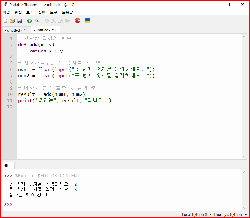 - Thonny 에디터에 아래의 예제 코드를 입력합니다.