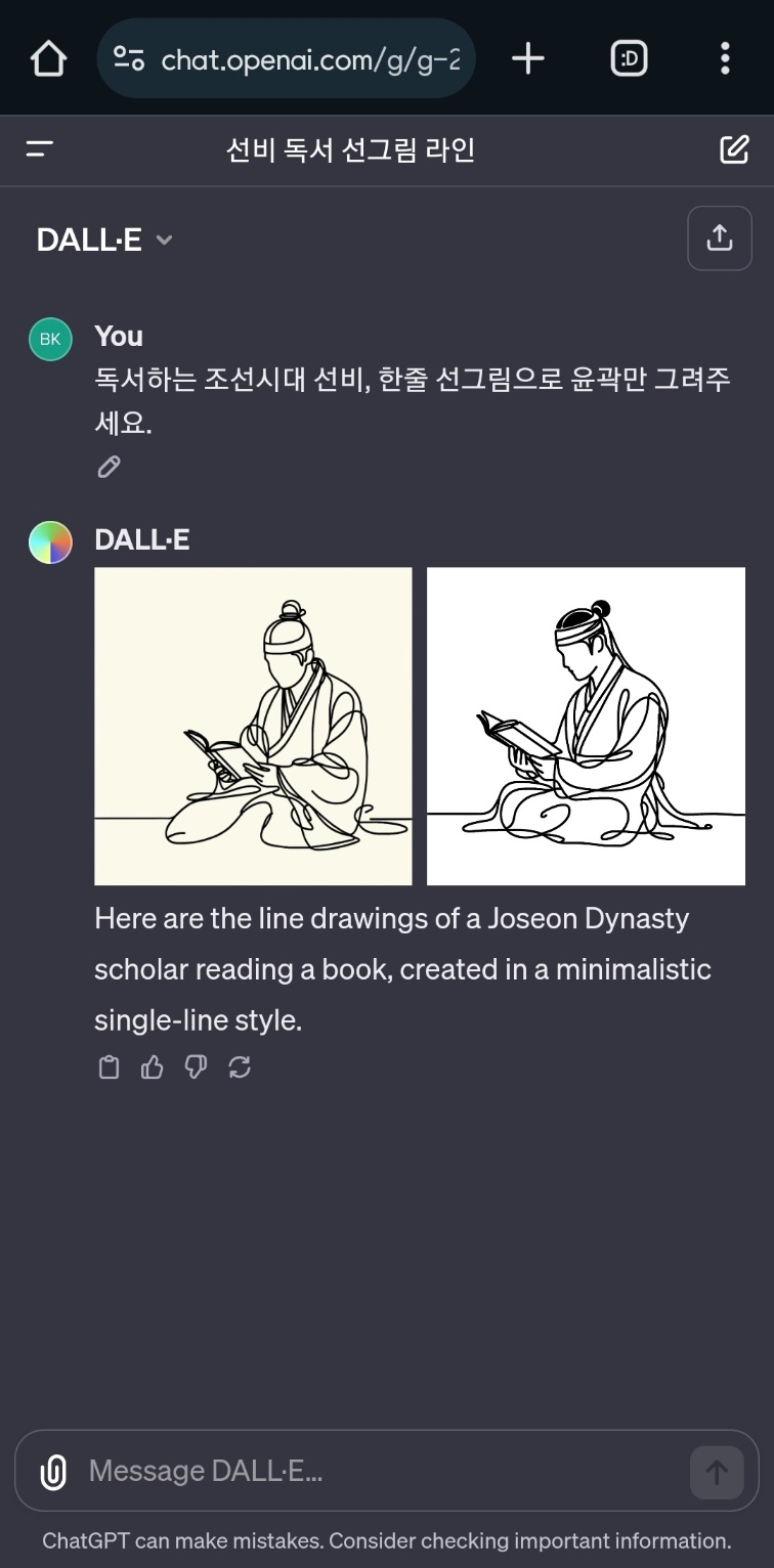 우설 공개된 GPTs는 OpenAI가 개발한 것들입니다. 개인 사용자도 자신의 필요에 의해 커스텀화가 가능합니다. 달리를 이용한 '선그림(線畵)'를 그려보도록 합니다. '조선시대 선비가 독서하는 모습'의 선그림을 요청했습니다.
