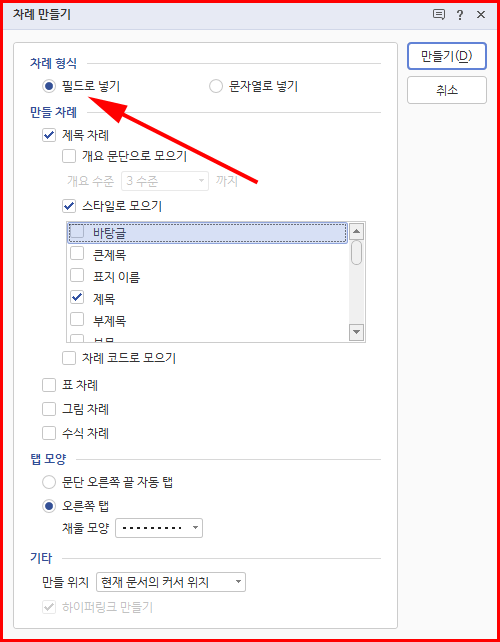 - 필드로 넣기: 이 옵션을 선택하면 차례의 각 항목이 '필드'로 삽입됩니다. 필드는 문서 내에서 특정 정보(예: 페이지 번호, 제목 등)를 동적으로 표시하는 데 사용되는 특수한 텍스트 유닛입니다. '필드로 넣기'를 사용하면 문서의 내용이 변경되었을 때, 차례의 페이지 번호나 텍스트가 자동으로 업데이트됩니다. 즉, 문서를 편집한 후 차례를 업데이트하면 실시간으로 내용이 반영됩니다.