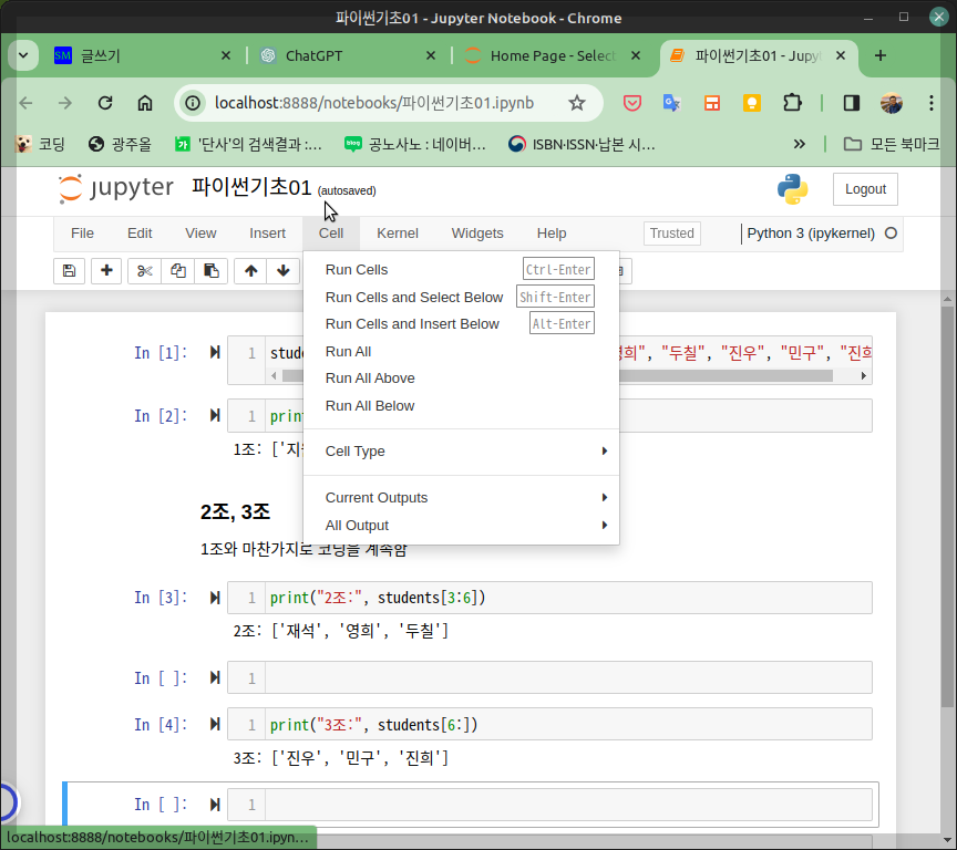 - Run All Below: 현재 선택된 셀을 포함하여 그 아래에 있는 모든 셀을 순서대로 실행합니다.