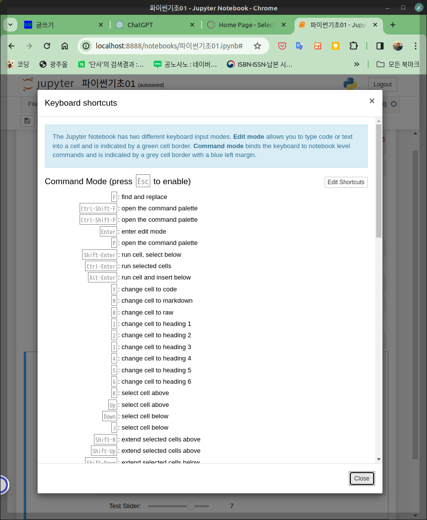 단축키는 명령 모드(셀을 선택한 상태)와 편집 모드(셀 내부에서 텍스트를 입력하는 상태) 일 때 다르게 작동합니다.