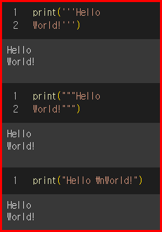 파이썬에서 문자열의 줄바꿈은 두 가지 방법이 있습니다. 따옴표 3개를 이용하여 줄바꿈을 하는 방법과 '\n'을 이용하는 두 가지 방법이 있습니다. '\n'은 '개행문자'라고 합니다. '개행'이란 행을 바꾼다는 의미입니다.
