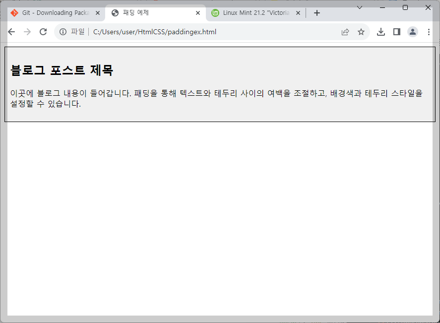 <p>이곳에 블로그 내용이 들어갑니다. 패딩을 통해 텍스트와 테두리 사이의 여백을 조절하고, 배경색과 테두리 스타일을 설정할 수 있습니다.</p>