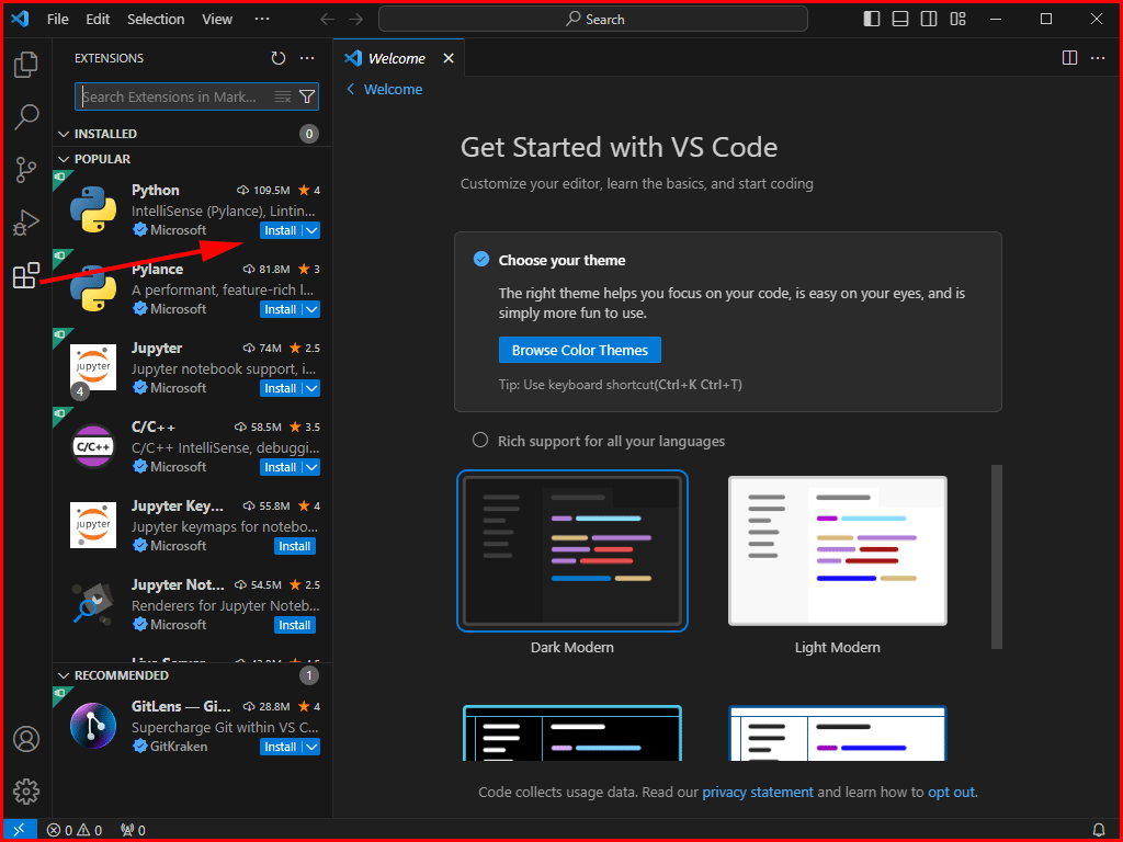- VS Code를 처음 실행하면 확장 프로그램을 설치할 수 있는 옵션이 표시됩니다.