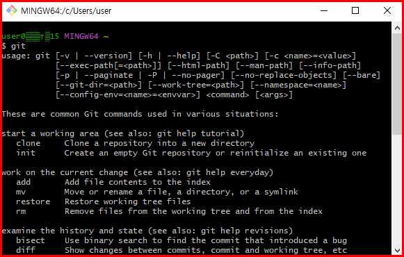 Git Bash에 'git' 명령을 실행한 결과