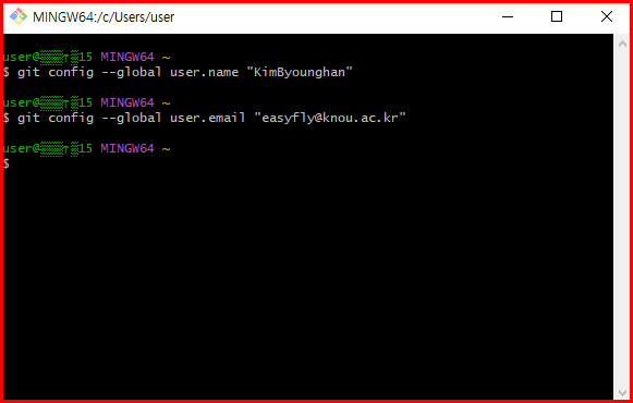 Git 설치 후, 개인 정보를 설정해야 합니다. 이는 Git 커밋에 사용자의 식별 정보를 포함시키기 위함입니다. 물론 github.com에 가입한 정보로 설정해야 합니다.