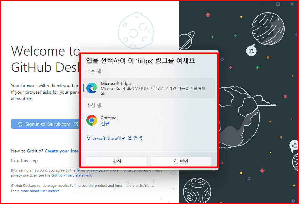 로그인은 웹브라우저에서 진행됩니다. 기본 브라우저가 위에 표시되고, 로그인이 가능한 브라우저가 아래에 제시됩니다. 자신이 원하는 브라우저를 선택합니다.