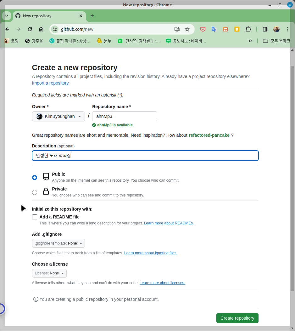 - 'Repository name'에 원하는 저장소 이름을 입력합니다.