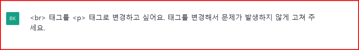 변경을 하는군요. 만족할 수준은 아니지만, 일단 내 말을 알아듣는 것을 확인했습니다. 다시 요구했습니다. 이번 요구는 'br' 태그 대신 문단 태그인 'p' 태그로 바꿔 달라는 요청을 했습니다.