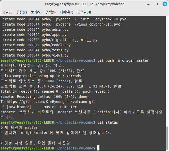 volcano프로젝트의 디렉토리로 이동합니다. - GitHub 저장소와 연결하기 위해 아래 명령어를 사용합니다: