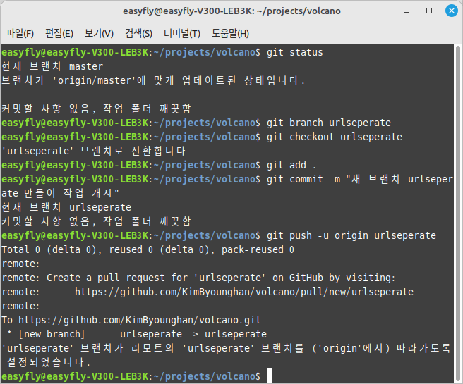 변경사항을 원격 저장소에 푸시하려면 다음과 같이 합니다. 이 명령은 로컬의 'urlseperate' 브랜치를 원격 저장소에 푸시하고, 이후 git push 명령어를 실행할 때 원격 브랜치 이름을 명시하지 않아도 되게 합니다.
