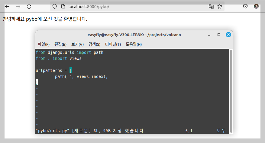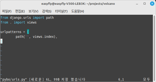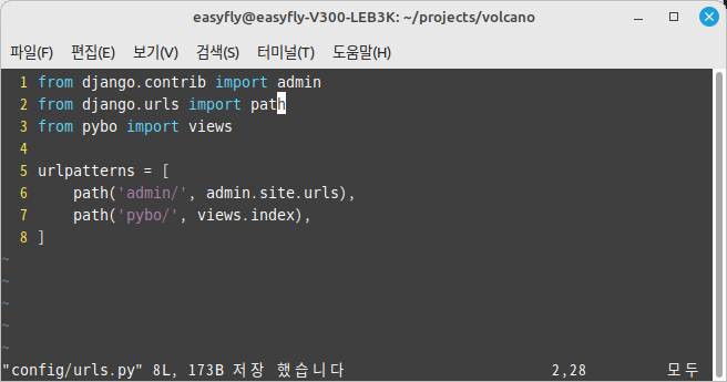 pybo 앱 디렉터리에 urls.py 파일을 생성합니다. 이 파일에서 장고 웹 프레임워크에서 URL 패턴을 정의하고 있습니다.파일의 내용은 다음과 같습니다.