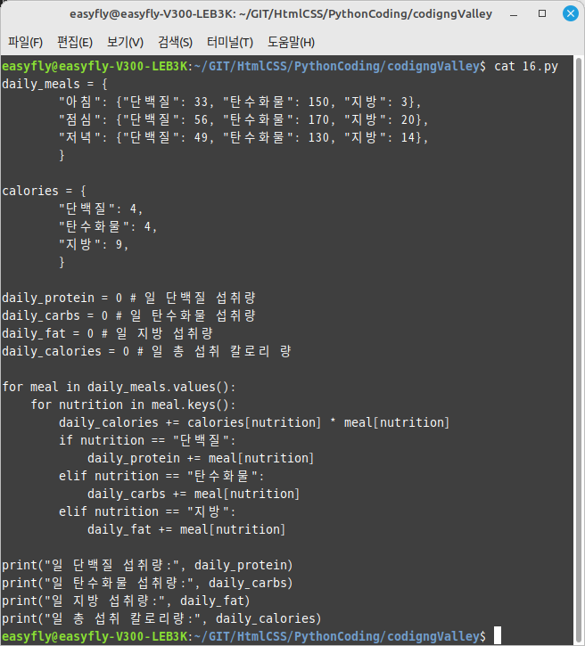 daily_meals라는 사전(dictionary) 객체를 생성합니다. 이 사전에는 각 식사의 이름을 키(key)로, 해당 식사에 포함된 영양소 정보를 또 다른 사전으로 저장하고 있습니다. 이 내부 사전에는 '단백질', '탄수화물', '지방'의 양이 각각 저장되어 있습니다.calories라는 또 다른 사전 객체를 생성합니다. 이 사전은 각 영양소가 1그램 당 몇 칼로리인지를 저장하고 있습니다. 여기서는 '단백질'과 '탄수화물'이 각각 4칼로리, '지방'이 9칼로리로 설정되어 있습니다.- 일일 단백질, 탄수화물, 지방의 섭취량과 총칼로리를 저장할 변수를 0으로 초기화합니다.