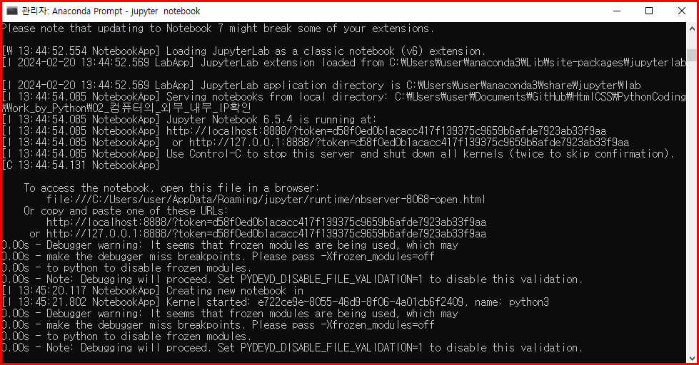 로그 메시지에는 몇 가지 경고가 포함되어 있지만, 이들은 주피터 노트북의 기능에 큰 영향을 주는 것은 아닙니다. 일반적으로, 사용자가 주피터 노트북을 처음 시작할 때 나타나는 메시지들로, 주피터 노트북 사용에 필요한 기본적인 정보들을 제공합니다.
