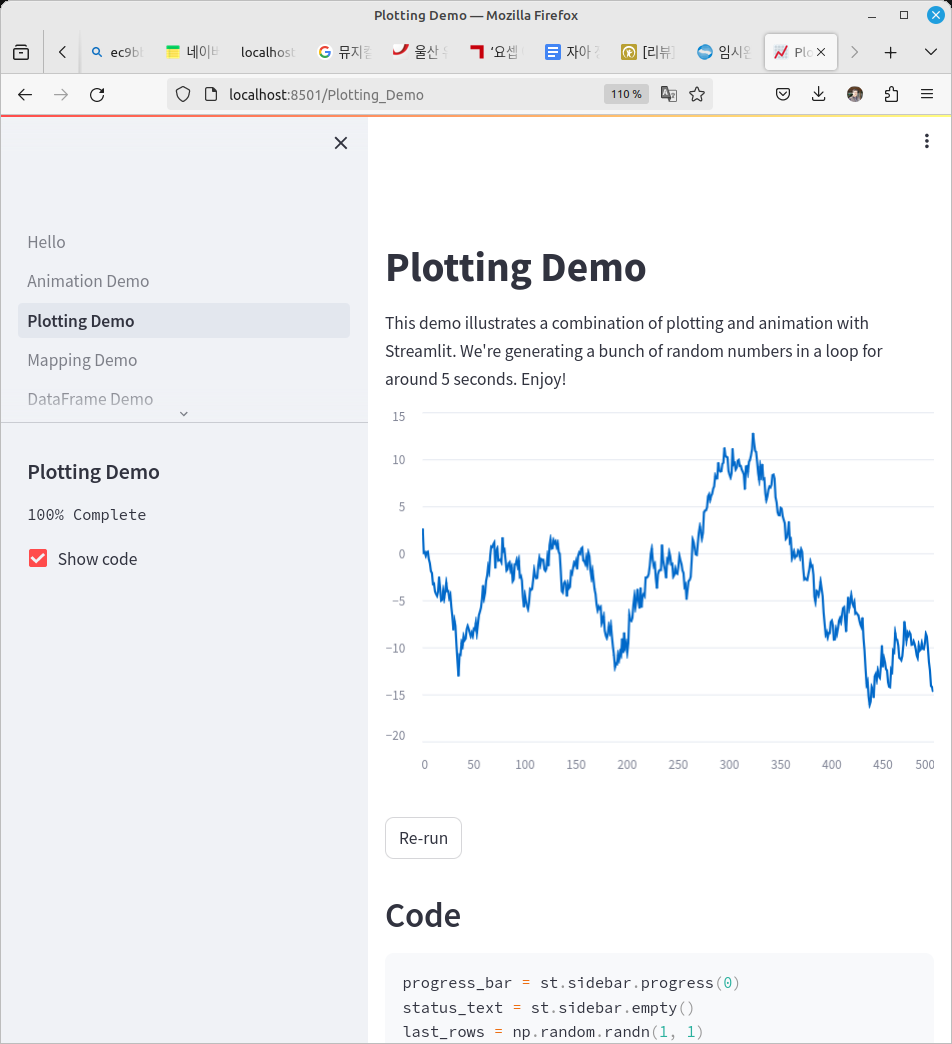 아래 이미지는 데이터 플로팅과 애니메이션의 조합을 보여줍니다. 이는 임의의 숫자를 생성하고 그 결과를 동적인 그래프로 나타내며, 사용자가 'Re-run' 버튼을 통해 애니메이션을 다시 실행할 수 있게 합니다. 이 방법은 금융, 경제, 과학 연구 등에서 데이터의 변화를 시간에 따라 보여주기 위해 사용될 수 있습니다.